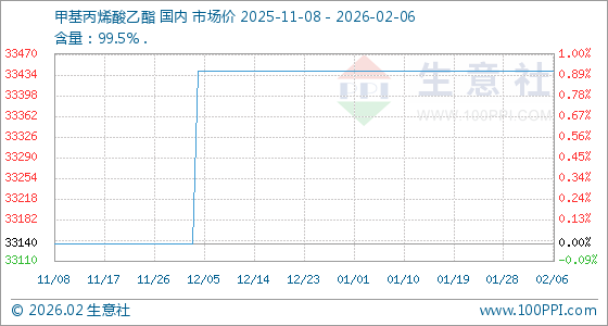2月6日,生意社甲基丙烯酸乙酯基准价为33440.00元/吨,与本月初持平。