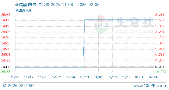 2月6日,生意社环戊酮基准价为25000.00元/吨,与本月初持平。
