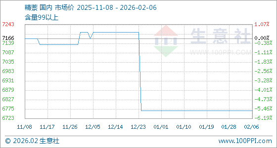 2月6日,生意社精萘基准价为6766.67元/吨,与本月初持平。