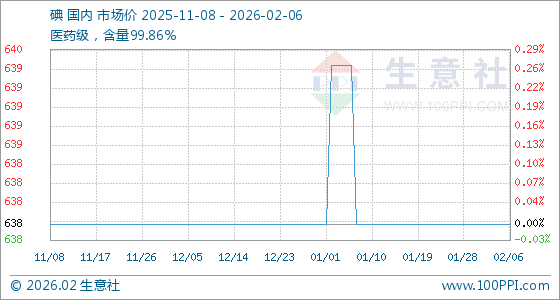 2月6日,生意社碘基准价为638.33元/千克,与本月初持平。