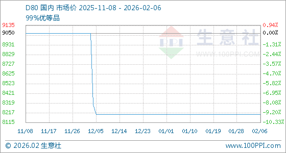 2月6日,生意社D80基准价为8200.00元/吨,与本月初持平。