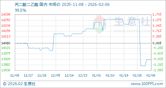 2月6日,生意社丙二酸二乙酯基准价为13925.00元/吨,与本月初(13875.00元/吨)相比,上涨了0.36%。