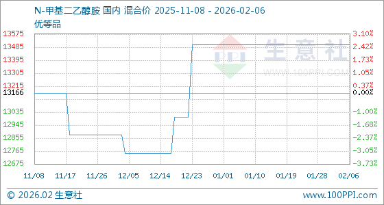 2月6日,生意社N-甲基二乙醇胺基准价为13500.00元/吨,与本月初持平。