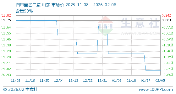 2月6日,生意社四甲基乙二胺基准价为31.00元/千克,与本月初持平。