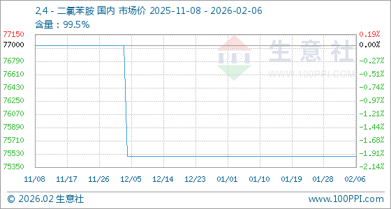 2月6日,生意社2,4-二氯苯胺基准价为75500.00元/吨,与本月初持平。