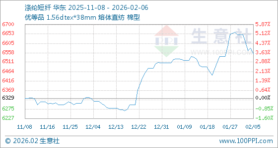 2月6日,生意社涤纶短纤基准价为6552.71元/吨,与本月初(6649.67元/吨)相比,下降了1.46%。