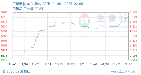 2月6日,生意社三聚氰胺基准价为5725.00元/吨,与本月初(5675.00元/吨)相比,上涨了0.88%。