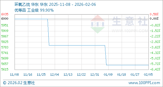 2月6日,生意社环氧乙烷基准价为5650.00元/吨,与本月初持平。