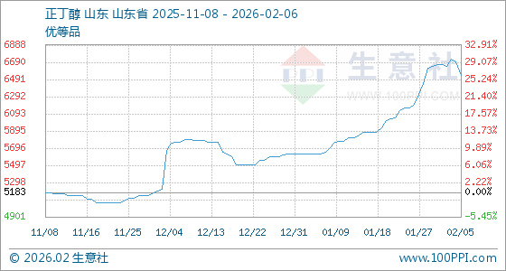 2月6日,生意社正丁醇(工业级)基准价为6533.33元/吨,与本月初(6663.33元/吨)相比,下降了1.95%。