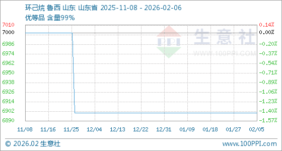 2月6日,生意社环己烷基准价为6900.00元/吨,与本月初持平。