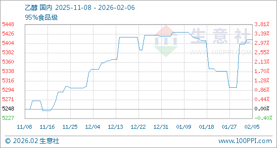 2月6日,生意社乙醇基准价为5413.33元/吨,与本月初(5403.33元/吨)相比,上涨了0.19%。
