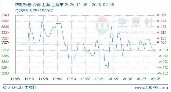 2月6日,生意社热轧板卷基准价为3310.00元/吨,与本月初(3323.33元/吨)相比,下降了0.4%。
