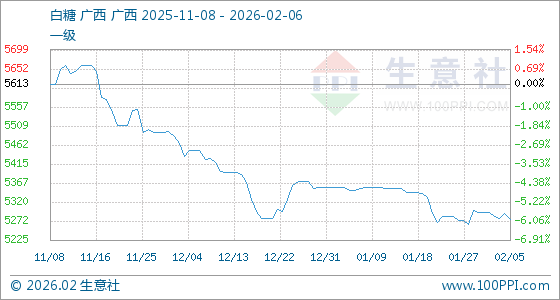 2月6日,生意社白糖基准价为5276.67元/吨,与本月初(5295.00元/吨)相比,下降了0.35%。