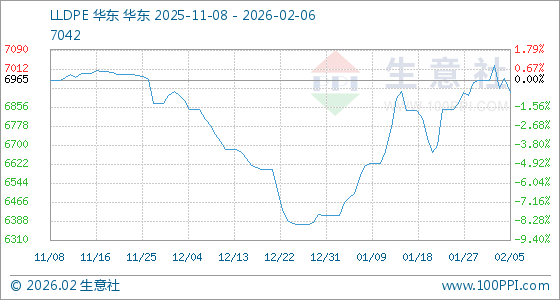 2月6日,生意社LLDPE基准价为6915.00元/吨,与本月初(6966.67元/吨)相比,下降了0.74%。