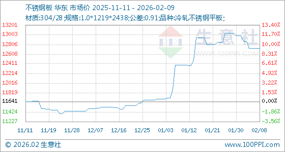 2月9日,生意社不锈钢板基准价为12725.00元/吨,与本月初(12991.67元/吨)相比,下降了2.05%。