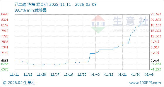 2月9日,生意社己二酸基准价为8333.33元/吨,与本月初(8066.67元/吨)相比,上涨了3.31%。