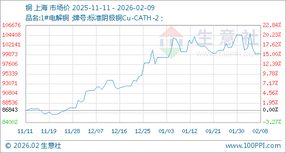 2月9日,生意社铜基准价为100035.00元/吨,与本月初(104496.67元/吨)相比,下降了4.27%。