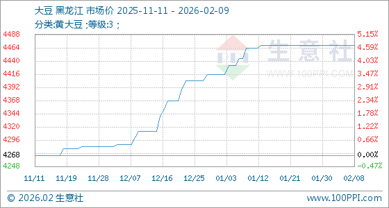 2月9日,生意社大豆基准价为4468.00元/吨,与本月初持平。