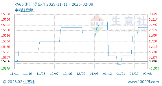 2月9日,生意社PA66基准价为15666.67元/吨,与本月初(15566.67元/吨)相比,上涨了0.64%。