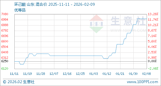 2月9日,生意社环己酮基准价为7000.00元/吨,与本月初(6900.00元/吨)相比,上涨了1.45%。