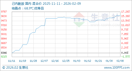 2月9日,生意社己内酰胺基准价为9656.67元/吨,与本月初(9573.33元/吨)相比,上涨了0.87%。