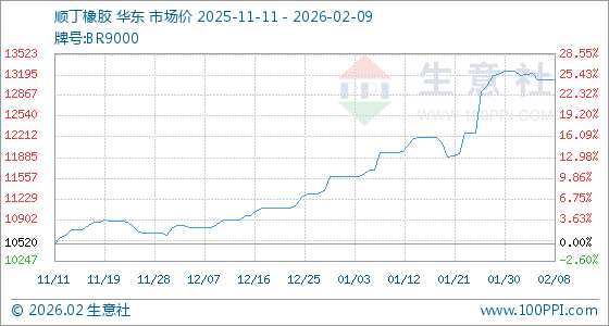 2月9日,生意社顺丁橡胶基准价为13120.00元/吨,与本月初(13250.00元/吨)相比,下降了0.98%。