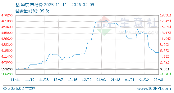 2月9日,生意社钴基准价为417400.00元/吨,与本月初(444800.00元/吨)相比,下降了6.16%。
