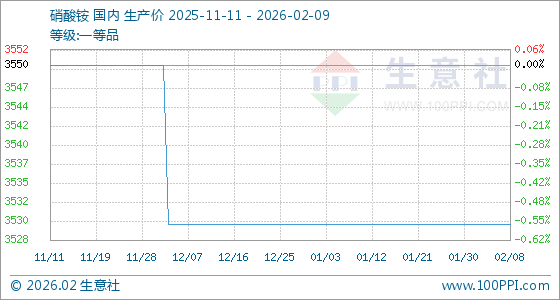 2月9日,生意社硝酸铵基准价为3530.00元/吨,与本月初持平。