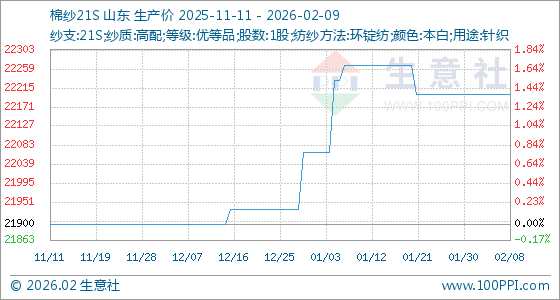 2月9日,生意社棉纱21S基准价为22200.00元/吨,与本月初持平。