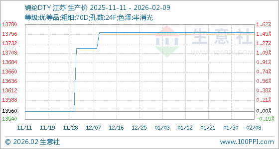 2月9日,生意社锦纶DTY基准价为13760.00元/吨,与本月初持平。