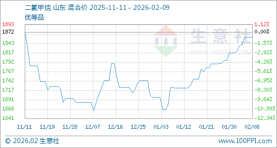2月9日,生意社二氯甲烷基准价为1860.00元/吨,与本月初(1817.50元/吨)相比,上涨了2.34%。