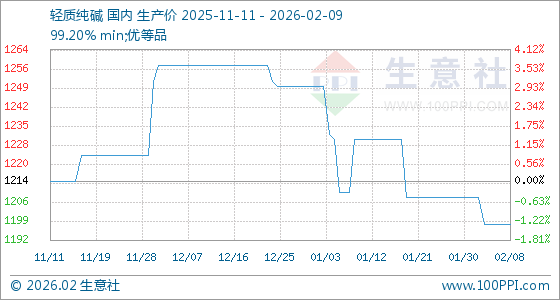 2月9日,生意社轻质纯碱基准价为1198.00元/吨,与本月初(1208.00元/吨)相比,下降了0.83%。