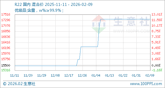 2月9日,生意社R22基准价为17333.33元/吨,与本月初持平。