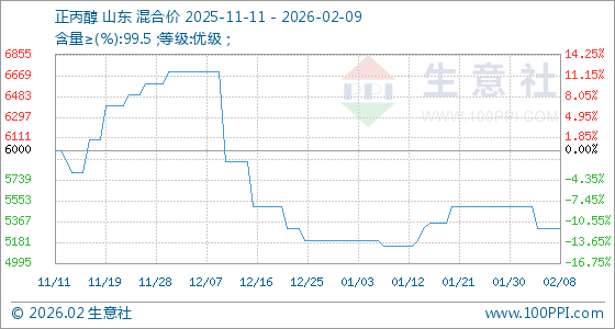 2月9日,生意社正丙醇基准价为5300.00元/吨,与本月初(5500.00元/吨)相比,下降了3.64%。