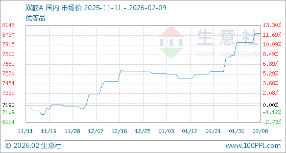 2月9日,生意社双酚A基准价为8050.00元/吨,与本月初(7940.00元/吨)相比,上涨了1.39%。