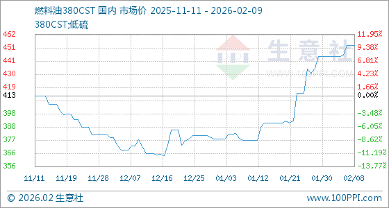 2月9日,生意社燃料油380CST基准价为453.50美元/吨,与本月初(445.00美元/吨)相比,上涨了1.91%。