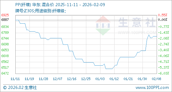 2月9日,生意社PP(纤维)基准价为6762.50元/吨,与本月初(6650.00元/吨)相比,上涨了1.69%。
