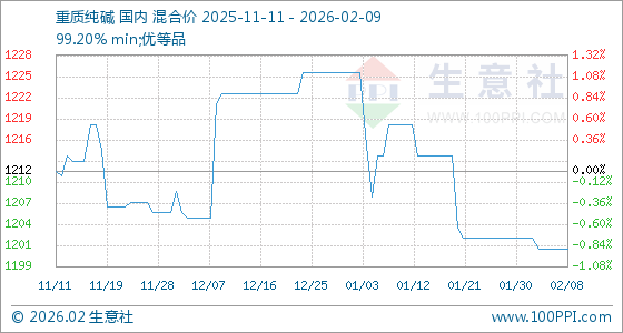 2月9日,生意社重质纯碱基准价为1201.43元/吨,与本月初(1202.86元/吨)相比,下降了0.12%。