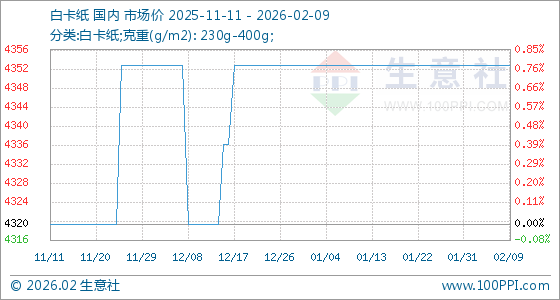 2月9日,生意社白卡纸基准价为4353.33元/吨,与本月初持平。