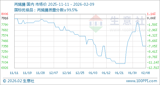 2月9日,生意社丙烯腈基准价为7366.67元/吨,与本月初(7650.00元/吨)相比,下降了3.7%。