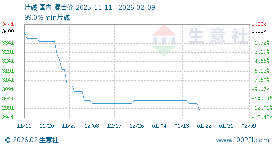 2月9日,生意社片碱基准价为2983.33元/吨,与本月初持平。