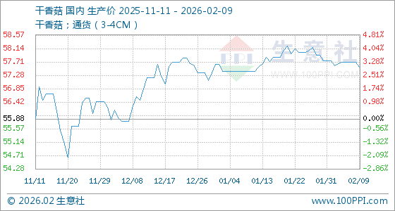 2月9日,生意社干香菇基准价为57.69元/公斤,与本月初(57.74元/公斤)相比,下降了0.09%。