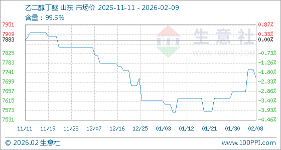 2月9日,生意社乙二醇丁醚基准价为7716.67元/吨,与本月初(7657.14元/吨)相比,上涨了0.78%。
