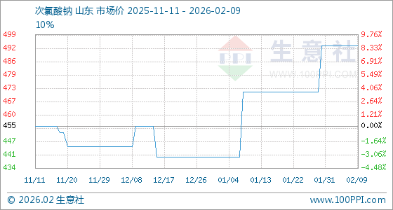 2月9日,生意社次氯酸钠基准价为494.00元/吨 ,与本月初持平。