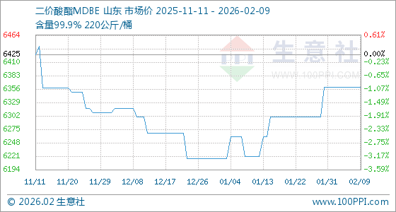 2月9日,生意社二价酸酯MDBE基准价为6360.00元/吨,与本月初持平。
