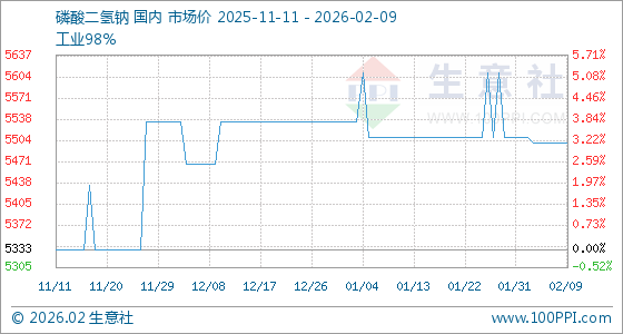 2月9日,生意社磷酸二氢钠基准价为5500.00元/吨,与本月初(5510.00元/吨)相比,下降了0.18%。