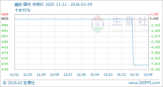 2月9日,生意社硼砂基准价为4283.33元/吨,与本月初持平。