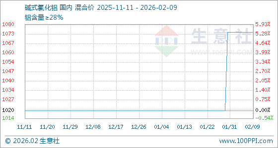 2月9日,生意社碱式氯化铝基准价为1075.00元/吨,与本月初持平。
