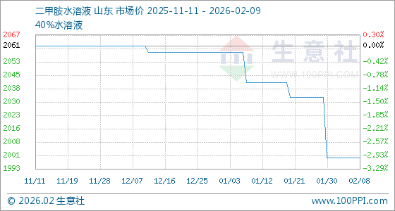 2月9日,生意社二甲胺水溶液基准价为2000.00元/吨,与本月初持平。