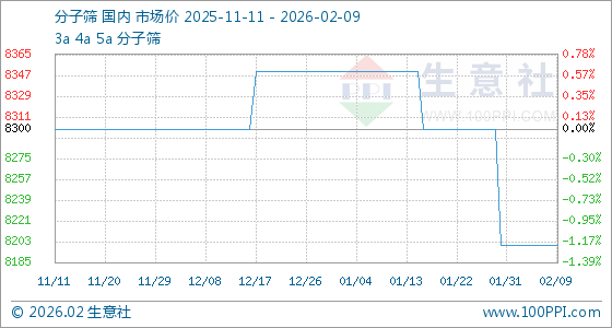 2月9日,生意社分子筛基准价为8200.00元/吨,与本月初持平。
